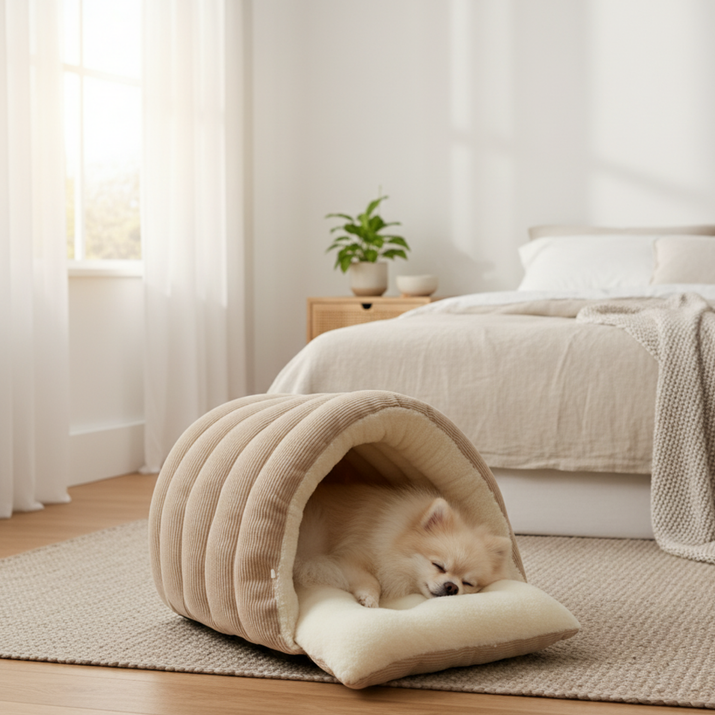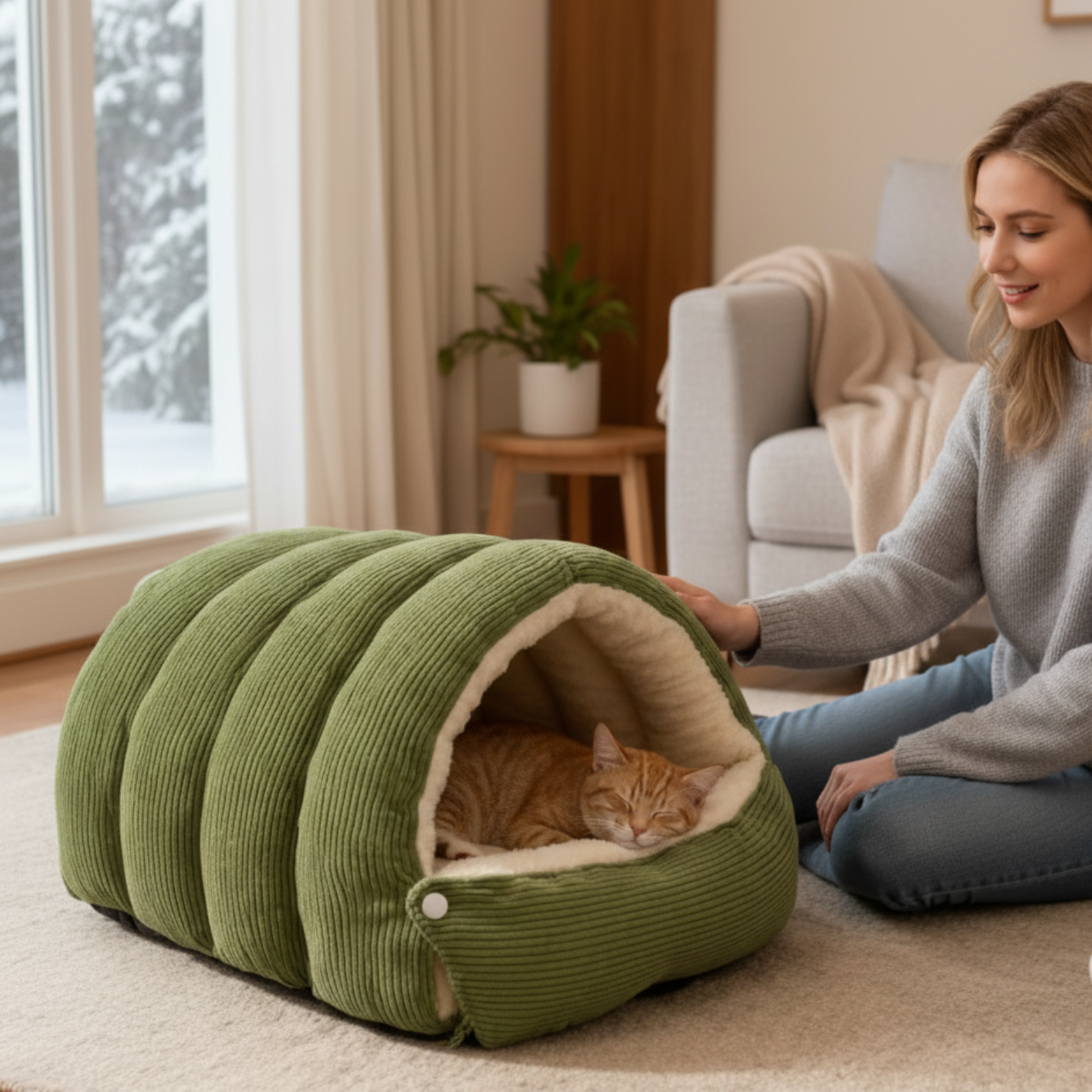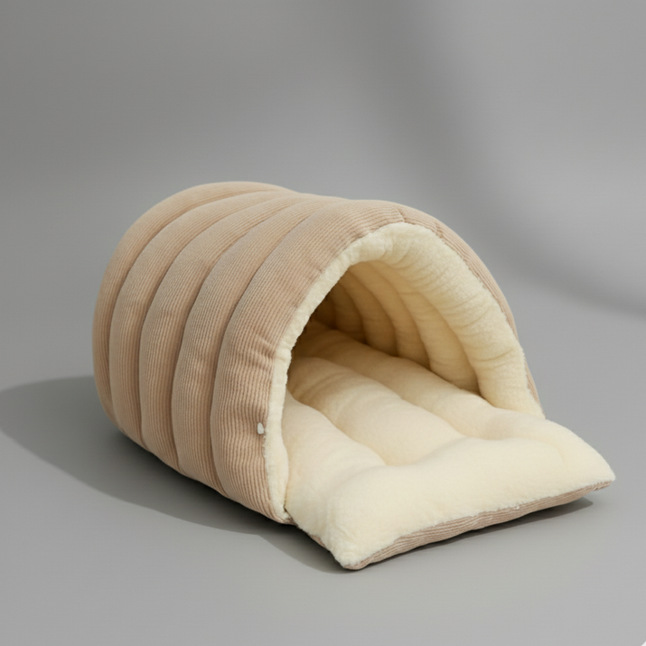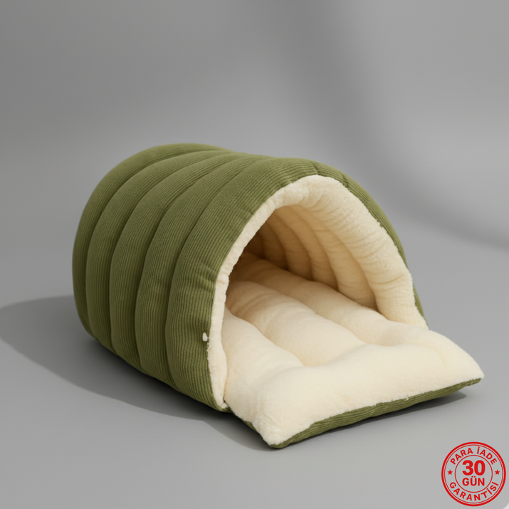 Pelüş kaplamalı yumuşacık kumaşıyla dostunuzu sarar, tünel formu sayesinde dış ortamdan izole bir “mini sığınak” oluşturur.